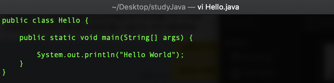 IDE를 사용하여 코드를 작성하고 컴파일 할 수 있지만 직접 파일을 생성하고 컴파일 해보자. 지정한 위치에 Hello.java 파일을 생성하고 자바 코드를 입력했다.